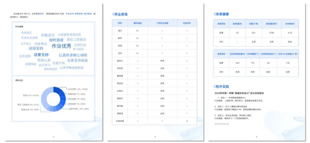 學校借助希沃魔方構建的“智能學生成長檔案”一站式完整記錄采集學生各方面數據。不僅將學生的日常評價數據、實踐活動、爭章等所有類型評價數據都清晰、直觀、美觀的呈現在檔案中,還把學生的學業表現與體質健康數據錄入,自動生成的“多元化”評語也更客觀的展現了學生的整體情況。