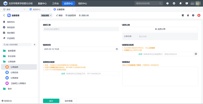 OA 流程自主調(diào)配,效率飛躍新境界:輕量化OA流程猶如一把靈活的工具,讓辦公變得輕松高效。學(xué)校根據(jù)實(shí)際辦公流程輕松搭建流程,就像搭建積木一樣進(jìn)行自由組合。以設(shè)備報(bào)修流程為例,以前繁瑣的報(bào)修流程,如今只需在OA系統(tǒng)中填寫(xiě)信息,拍攝問(wèn)題照片添加描述,申請(qǐng)便會(huì)流轉(zhuǎn)到相關(guān)維修人員處進(jìn)行設(shè)備問(wèn)題預(yù)警,維修完成后,領(lǐng)導(dǎo)可收到通知進(jìn)行結(jié)果核實(shí),讓整體流程變得高效便捷。