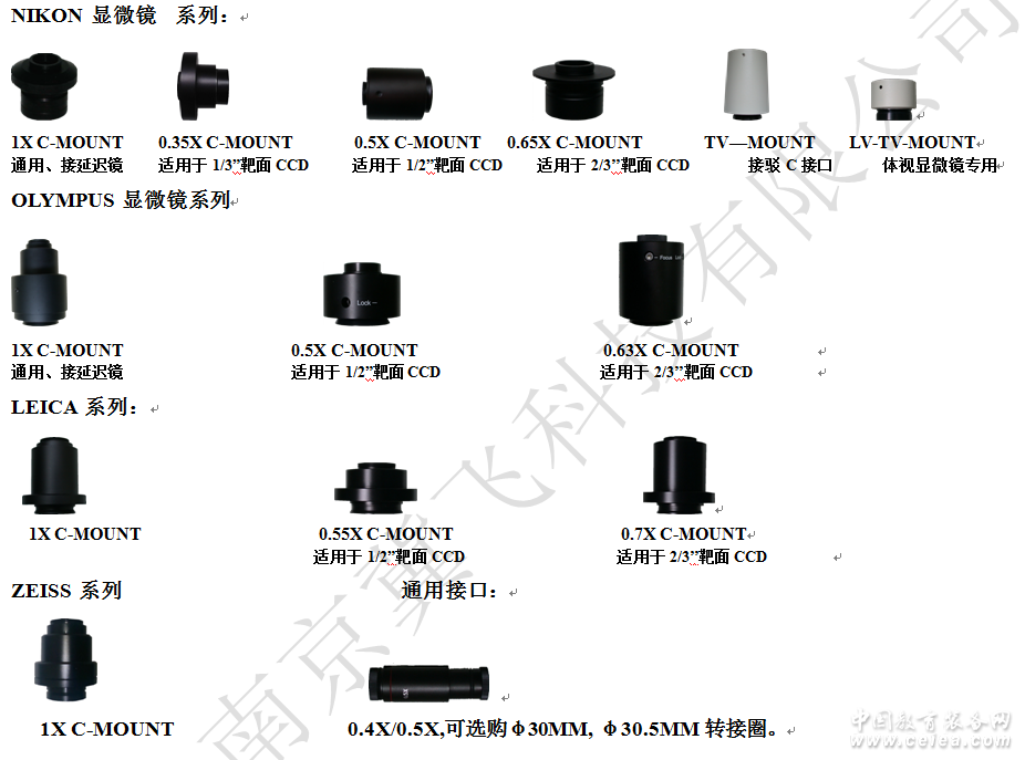 產品詳細介紹NIKON顯微鏡系列: 1X C-MOUNT 0.5X C-MOUNT 0.65X C-MOUNT TV—MOUNT LV-TV-MOUNT 通用/接延遲鏡 適用于1/2”靶面CCD 適用于2/3"靶面CCD 接駁C接口 體視/金相顯微鏡專用