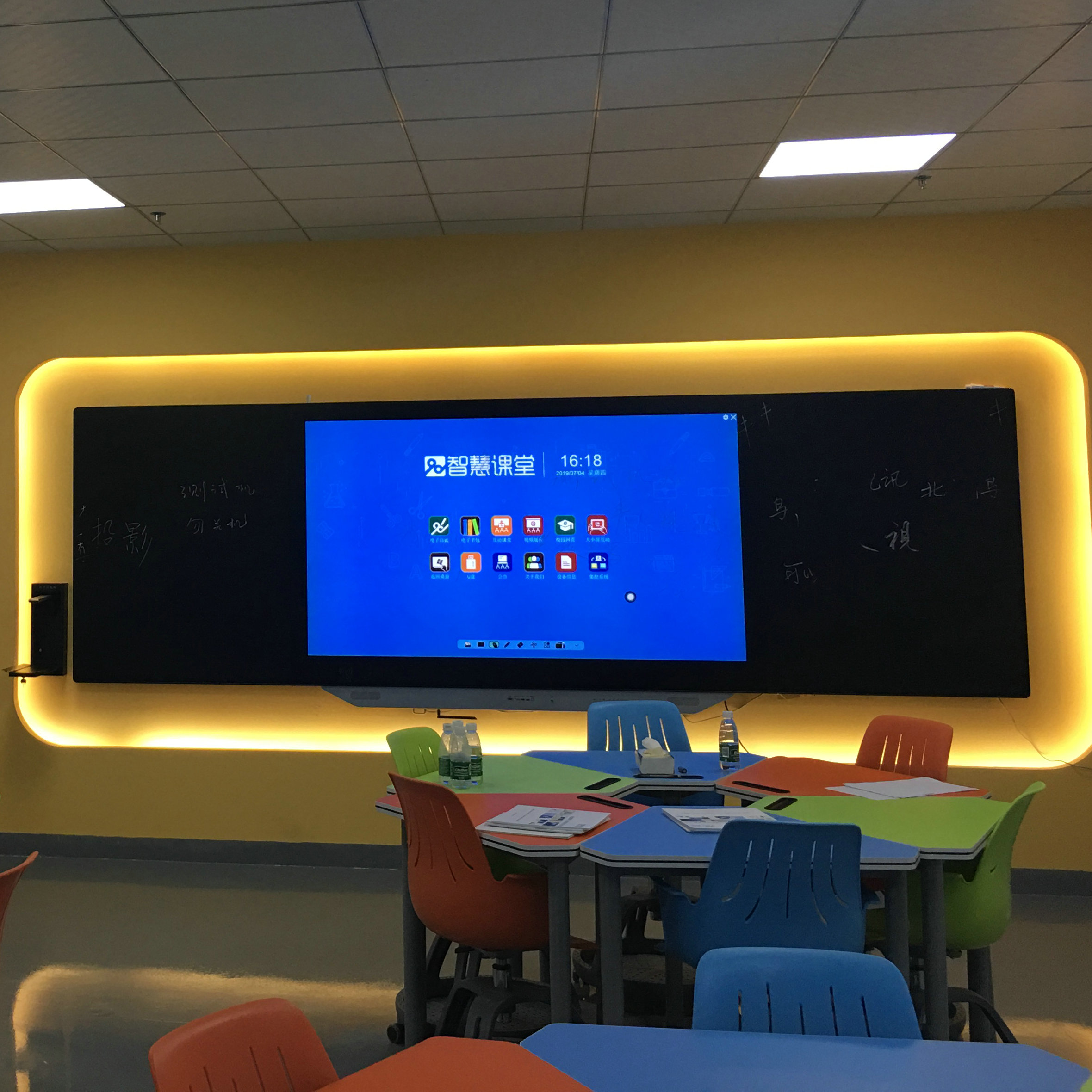 觸控技術(shù):納米觸摸技術(shù)(采用內(nèi)置觸摸技術(shù),非外掛觸件),十點或以上觸摸,在嵌入式操作系統(tǒng)下至少支持2筆書寫,在Windows操作系統(tǒng)下至少支持4筆書寫。 多點書寫技術(shù):能在Windows自帶畫圖軟件中實現(xiàn)多點書寫,支持兩筆任意角度平行畫線(距離小于3厘米)不產(chǎn)生交叉點。 觸摸屏在連接Windows操作系統(tǒng)(XP、Vista、Win7、Win8)、Linux操作系統(tǒng)、Mac操作系統(tǒng)的電腦外部設(shè)備時,無需安裝驅(qū)動。 計算機響應(yīng):切換通道時,系統(tǒng)能在切換通道后1秒內(nèi)自動識別切換內(nèi)外部觸摸通道。 軟件中控系統(tǒng):具備前置觸摸能手勢識別調(diào)出軟件中控頁面,隱藏式設(shè)計,位于液晶屏幕正前方,防水防塵;在電視、電腦、VGA、HDMI等各通道模式下均可在液晶屏上實現(xiàn)觸摸功能,可實現(xiàn)物理按鍵全部功能。同時保留前置物理按鍵,達到功能按鍵雙保障設(shè)計。 整體表現(xiàn)特性:正面顯示為一個由三塊拼接而成的平面普通黑板,可以在上面用各種水筆書寫,又可以根據(jù)需要采用粉筆書寫。當(dāng)打開電源時,中間一塊顯示出液晶的顯示畫面,可以進行觸摸互動,而關(guān)掉時,顯示畫面隱形,又顯示為一個普通黑板的表象,在上面進行書寫。 五、產(chǎn)品尺寸 開機效果