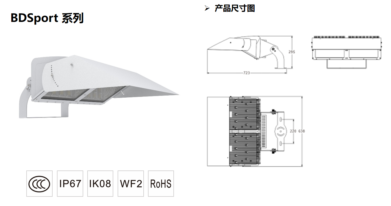 應用范圍 廣泛應用于各級別體育場館照明。 型號(Model) BDX-GM500-D 光源(Light source) 進口光源 功率(Power) 500W 光通量(Luminaire flux) ≥60000 lm 光效(Luminaire efficacy) ≥120 lm/W 色溫(CCT) 5700K 顯色指數(CRI) Ra>80 R9>0 壽命(Lifetime) ≥50000小時 工作溫度(Operating temperature range) -30℃~+50℃ 輸入電壓(Input voltage) AC100-240v / 50-60Hz 電器保護等級(Electrical protection) Class I 防護等級(IP Grade) IP67 抗沖擊等級(Impact resistance) IK08 防腐等級(Corrosion protection) WF2 材質(Material) ADC12 外形尺寸(Dimension) 723*638*295mm 產品重量(Net weight) 25.9KG |