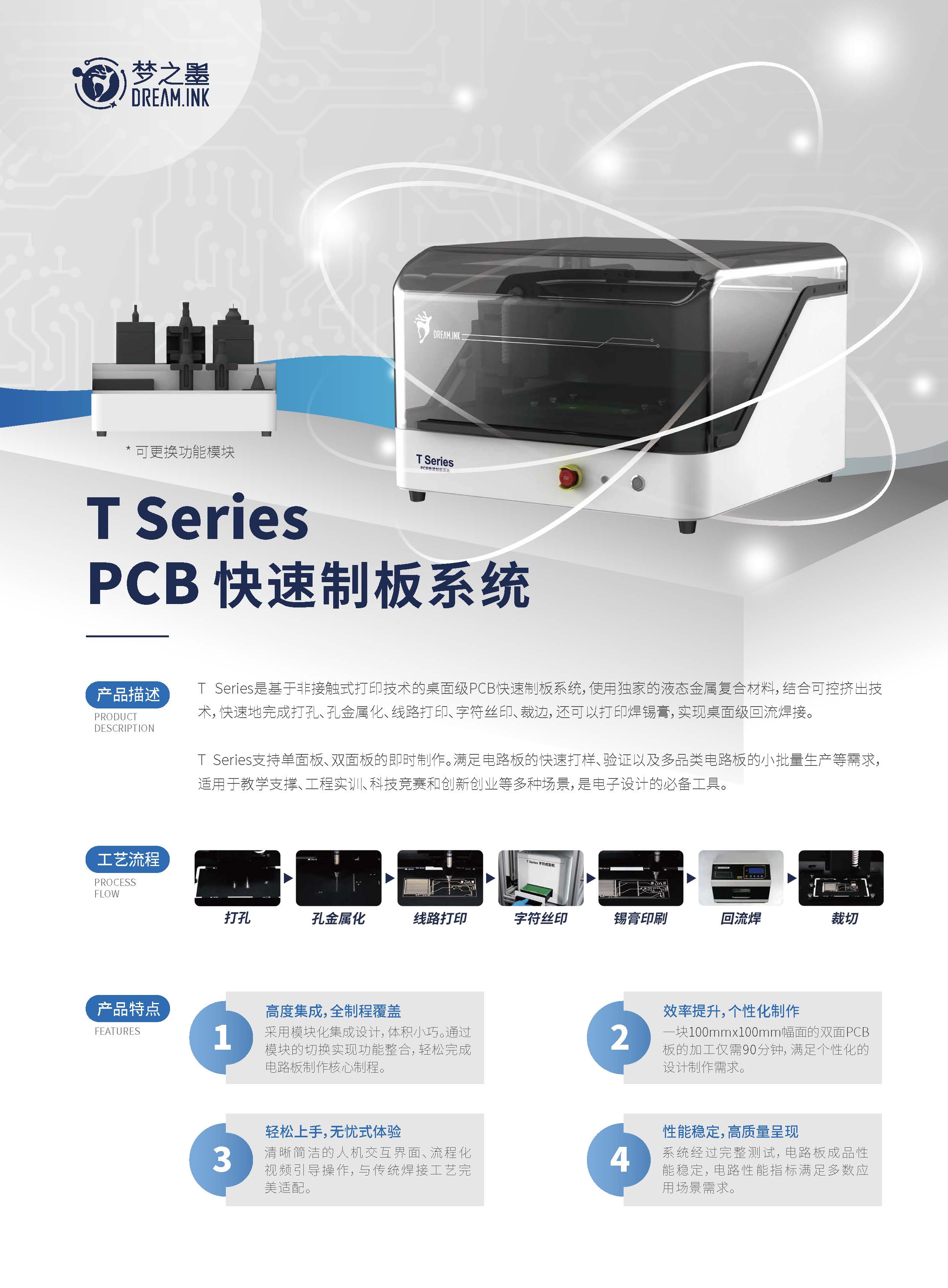 T Series是基于非接觸式打印技術的桌面級PCB快速制板系統,使用液態金屬復合材料,結合可控擠出技術,快速地完成打孔、孔金屬化、線路打印、字符絲印、裁邊,還可以打印焊錫膏,實現桌面級回流焊接。