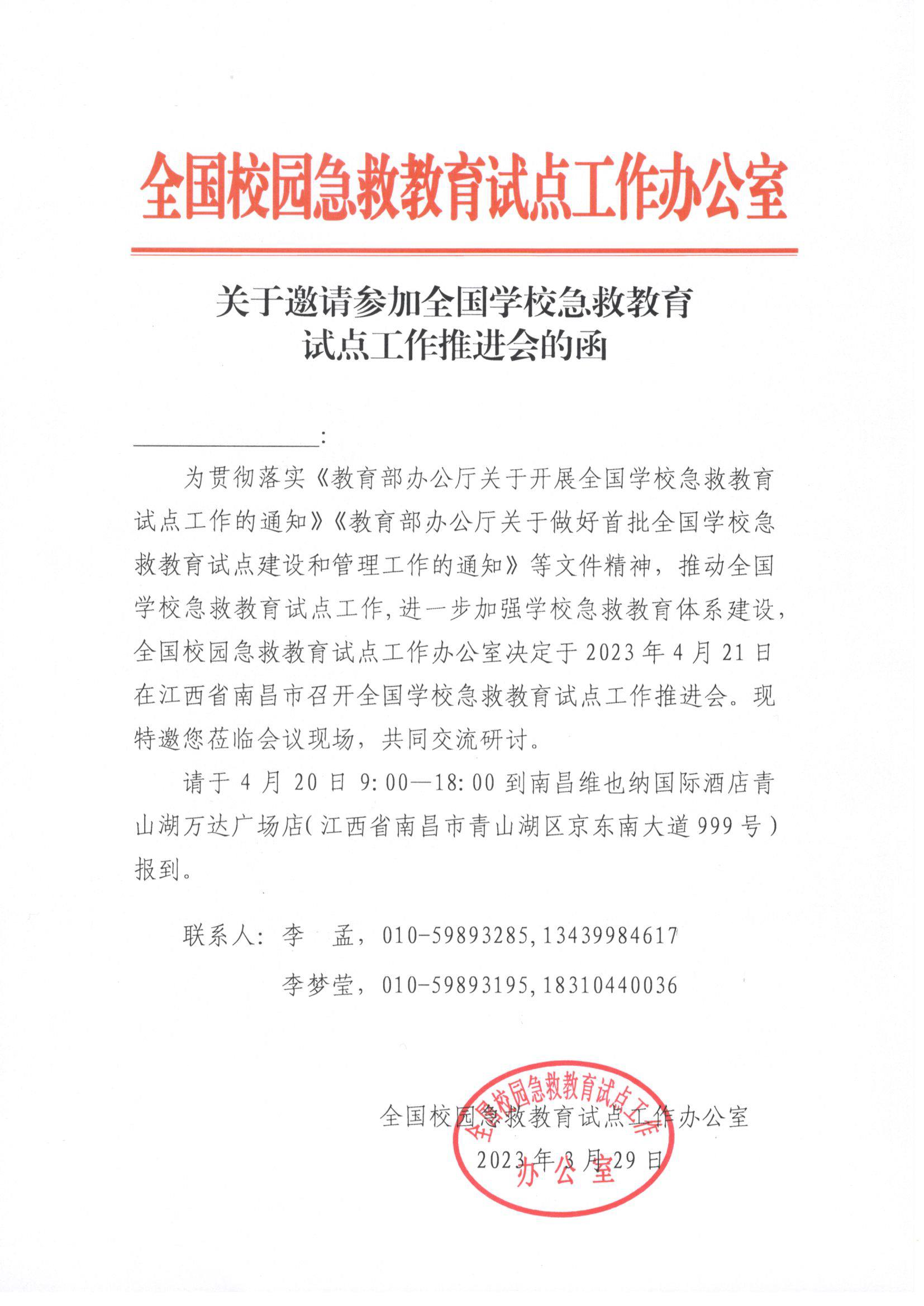 為貫徹落實(shí)《教育部辦公廳關(guān)于開展全國(guó)學(xué)校急救教育試點(diǎn)工作的通知》《教育部辦公廳關(guān)于做好首批全國(guó)學(xué)校急救教育試點(diǎn)建設(shè)和管理工作的通知》等文件精神,推動(dòng)全國(guó)學(xué)校急救教育試點(diǎn)工作,進(jìn)一步加強(qiáng)學(xué)校急救教育體系建設(shè),全國(guó)校園急救教育試點(diǎn)工作辦公室決定于2023年4月21日在江西省南昌市召開全國(guó)學(xué)校急救教育試點(diǎn)工作推進(jìn)會(huì)。現(xiàn)將有關(guān)事宜通知如下。